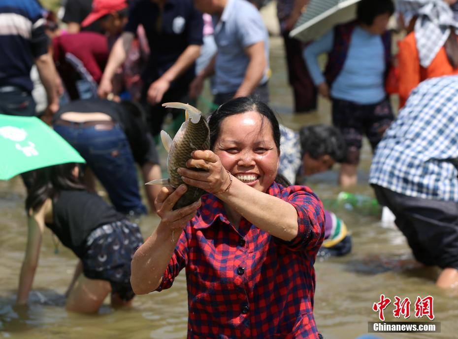 广西融水苗族自治县一名苗族群众在闹鱼。石峰 摄