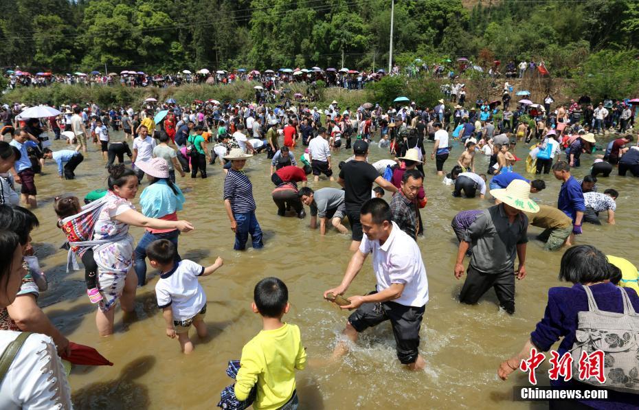 在“三月三”壮歌节现场,各族群众参与闹鱼活动之中。石峰 摄