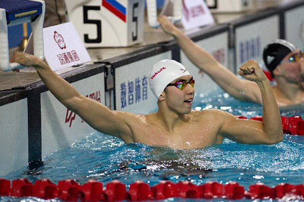 4月18日,闫子贝在比赛后庆祝。当日,在太原进行的2018年全国游泳冠军赛暨亚运会选拔赛男子50米蛙泳决赛中,湖北队选手闫子贝以27秒16的成绩夺冠并打破该项目全国纪录。