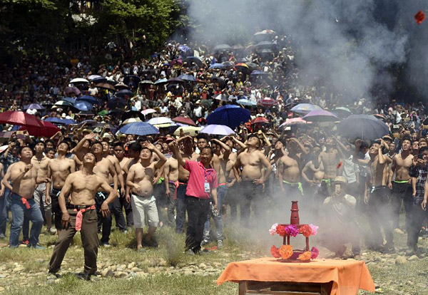 4月18日,人们在广西三江侗族自治县富禄苗族乡都柳江畔参加抢花炮。当日,广西柳州市三江侗族自治县富禄苗族乡举办“三月三”花炮节,来自黔、桂两省区的25支代表队同场竞技,欢庆“三月三”。抢花炮被誉为“中国式橄榄球”,因对抗激烈、趣味性强而深受人们喜爱,在比赛中抢到花炮是吉祥幸福的象征。