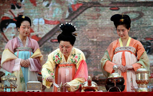 4月18日,茶艺师用碾子碾磨茶饼。当日,一场仿唐烹茶秀在西安一茶城举行。活动上,装扮成唐代仕女的茶艺师使用唐代茶具仿品,展示了炙茶、臼茶、碾磨、过筛、烹茶、分茶、吃茶等多项步骤,完整还原了唐代烹茶流程,再现传统茶艺。