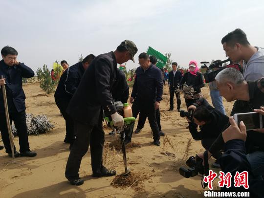 图为在库布其沙漠上举行的“大型义务植树活动”现场。李爱平 摄