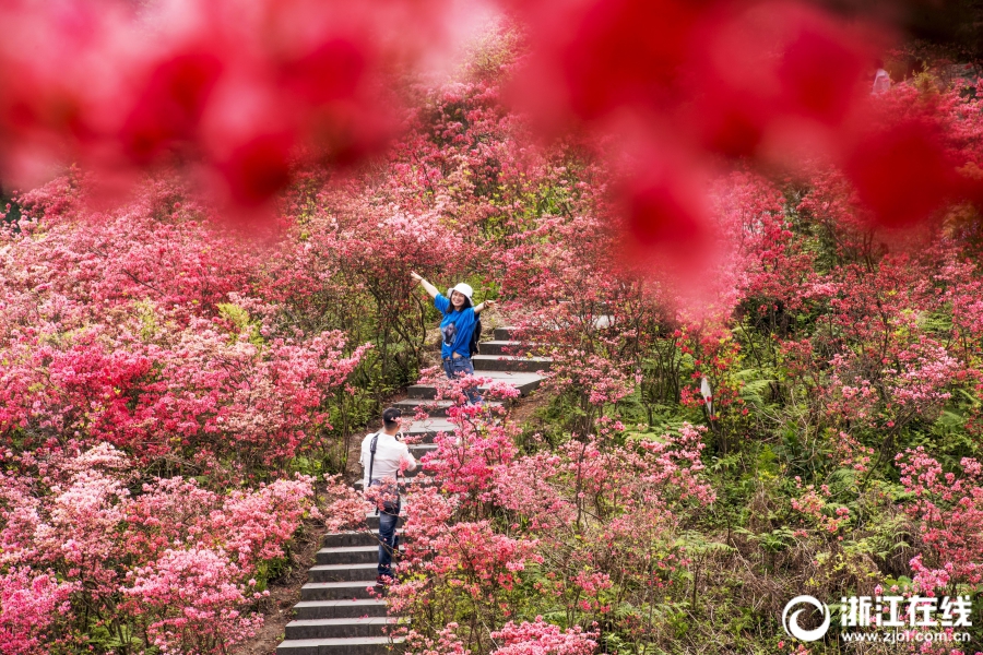 4月21日,全国森林旅游示范县、浙中杜鹃谷——磐安县盘峰乡高姥山核心区块的2000多亩各色杜鹃竞相争艳,满山遍野杜鹃姿态万千,花团锦簇,身临其中,宛如置身仙境。(浙江在线拍友 陈溢之 摄)