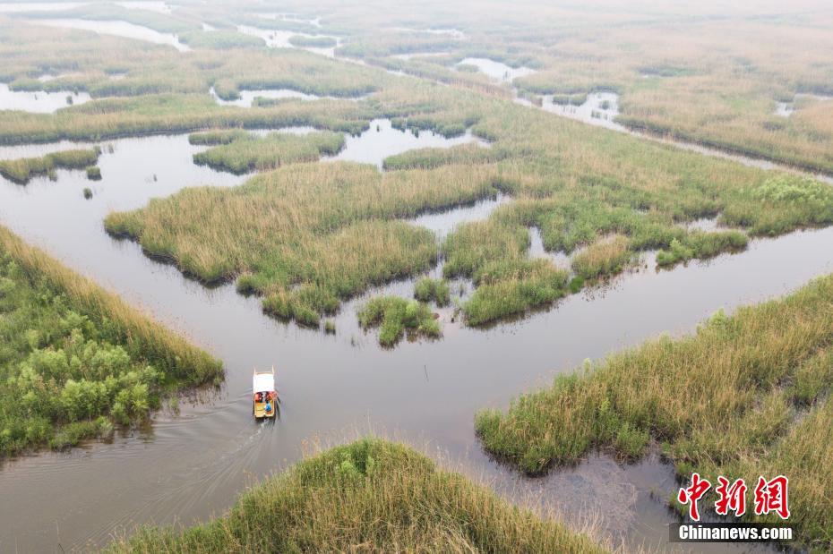 4月22日,航拍江苏高邮湖,游客乘坐游船穿行“芦苇迷宫”,感受大自然的气息。中新社记者 泱波 摄