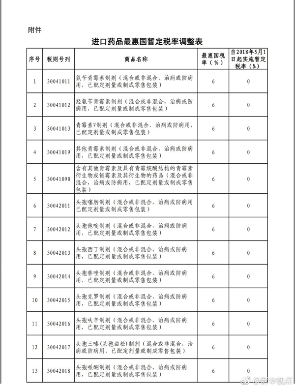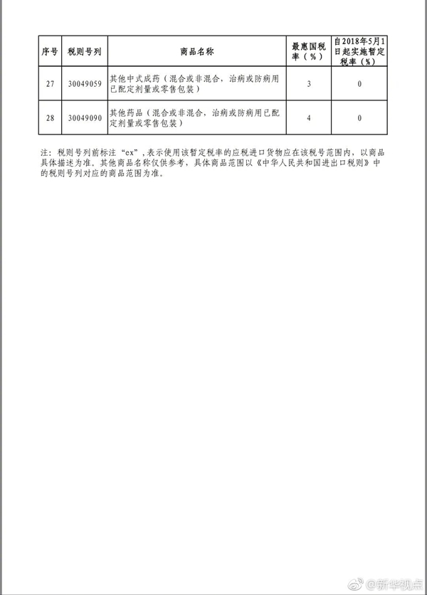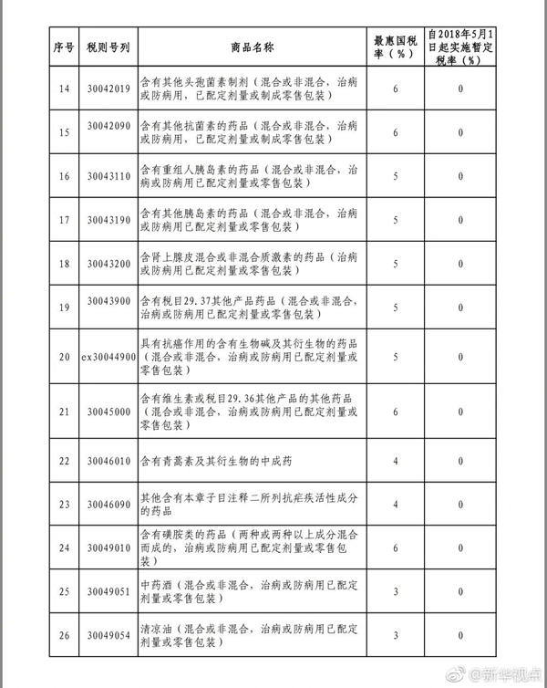 新华网北京4月23日电 财政部关税司23日发布消息,5月1日起我国将取消包括抗癌药在内的28项药品进口关税。调整后,除安宫牛黄丸等我国特产药品、部分生物碱类药品等少数品种外,绝大多数进口药品,特别是有实际进口的抗癌药均将实现零关税。(记者郁琼源) (据新华社“新华视点”微博报道)