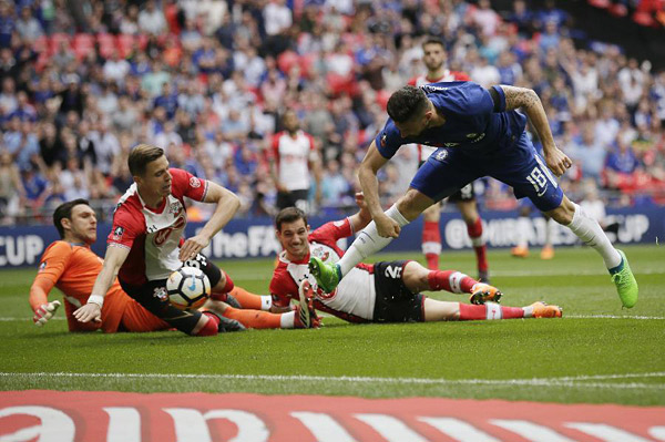 切尔西4月22日在足总杯半决赛中以2:0战胜南安普敦队闯入决赛,他们将在5月19日与曼联争夺冠军。图为切尔西队球员吉鲁(右一)在比赛中射门得分。