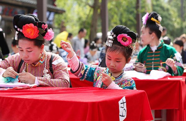 4月22日,在贵州省丹寨县万达小镇,一名绣娘带着一名小朋友参加刺绣比赛。当日,贵州省丹寨县万达小镇举办“指尖上的传承”非遗手工技艺比赛,县内各村寨的近90名绣娘参加了苗族手工刺绣和苗族蜡染绘画比赛。