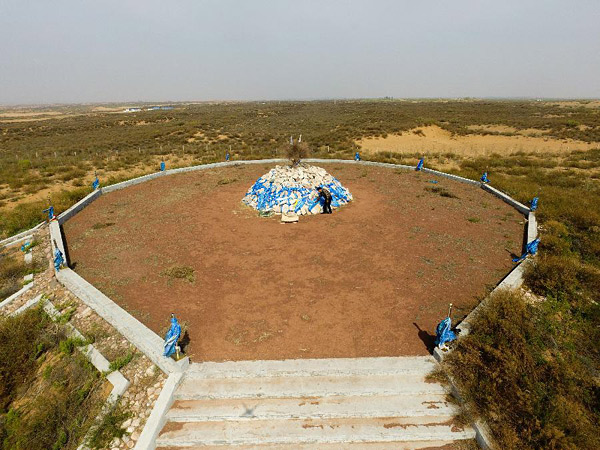 4月22日,阿拉腾毕力格在整理书敖包(无人机拍摄)。在内蒙古自治区乌审旗巴音希里嘎查,有座独特的敖包,牧民们亲切地称呼它为“书敖包”。那是牧民阿拉腾毕力格和弟弟哈斯毕力格用3000多块石头堆起的敖包,每块石头上用蒙古文刻着书名。出于对书籍的热爱,兄弟俩在政府的帮助下修建了“书敖包”以及图书馆,用这种传统的形式唤起牧民们对书籍的重视,搭建知识的桥梁。目前图书馆存放有4万多册图书。周边牧民忙完生产后,会抽空到图书馆借书、看书,生活中如果遇到法律、健康、畜牧养殖等方面的问题,也会到图书馆来查找资料。