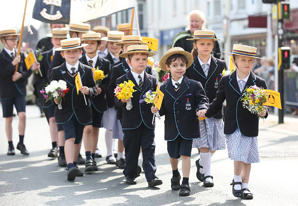 4月21日,在英国埃文河畔斯特拉特福小镇,小学生们参加游行活动。当日,人们在莎士比亚出生地英格兰中部城市埃文河畔斯特拉特福小镇举行活动,纪念这位文学巨匠诞辰454周年。