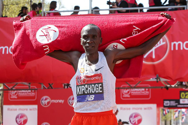 第38届伦敦马拉松4月22日举行,肯尼亚选手包揽了男、女冠军。当天的比赛在23.2摄氏度的“高温”下举行,是伦敦马拉松历史上气温最高的一届。33岁的里约奥运会冠军基普乔盖以2小时4分17秒的成绩率先抵达终点,继2015年和2016年之后第三次夺冠,成为继同胞莱尔和墨西哥选手塞容之后,第三位三次赢得伦敦马拉松男子冠军的运动员。图为基普乔盖在获胜后庆祝。