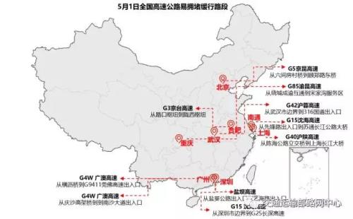 5月1日,全国高速路易拥堵缓行路段。来自交通部路网中心微信公号。