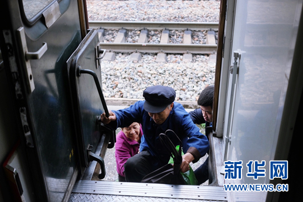 两位老人在列车员帮助下登上6905/8列车。(4月24日摄)新华网陈俊松 摄