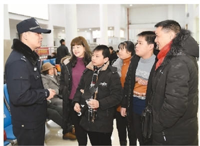 二月九日,民警在侨乡浙江青田火车站为归国返乡华侨介绍乘车安全注意事项。新华社记者 黄宗治 摄