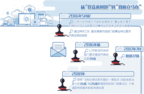 从2016年5月份起,北京市分批持续清理市级党政群机关、事业单位要求开具涉及企业和群众办事创业的各类证明。通过两年工作,基本摸清市级部门和事业单位要求开具证明的底数。2016年底,公开取消市政府部门要求基层开具的证明74项;2017年7月份取消77项;今年则按照“没有法律法规依据的一律取消”的标准取消第三批76项。今年取消的76项证明中,有26项根据国务院部门规章设定,已报请国务院相关机构协调处理。