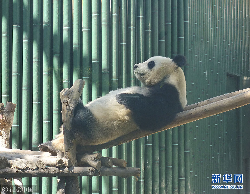 5月2日,在动物园内,熊猫晒着太阳,时不时伸个懒腰,翻个身,笨拙的动作尽显萌态。(图片来源:视觉中国)