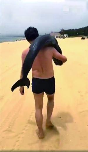昨天,网络流传的多段视频显示,一名身穿泳衣的男子疑似背上扛着一只海豚在沙滩行走(见图)。多位网友回复称,该事件发生于广东阳江市海陵岛沙滩附近,涉事男子直接把海豚扛走。