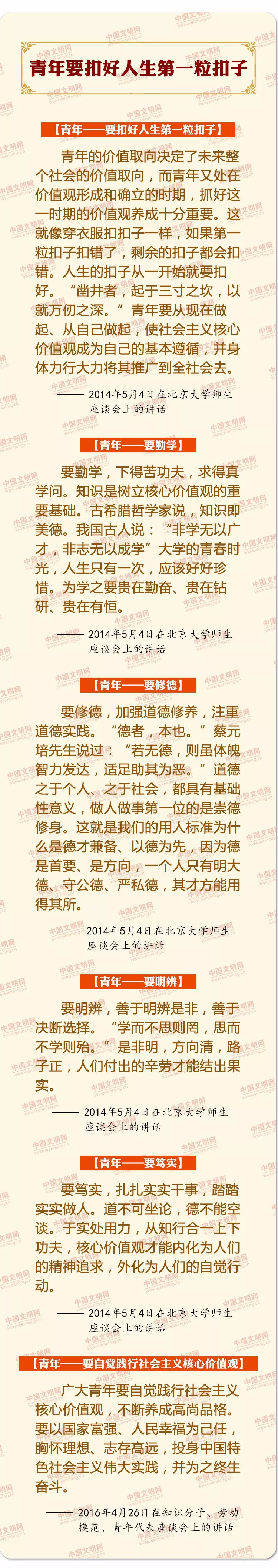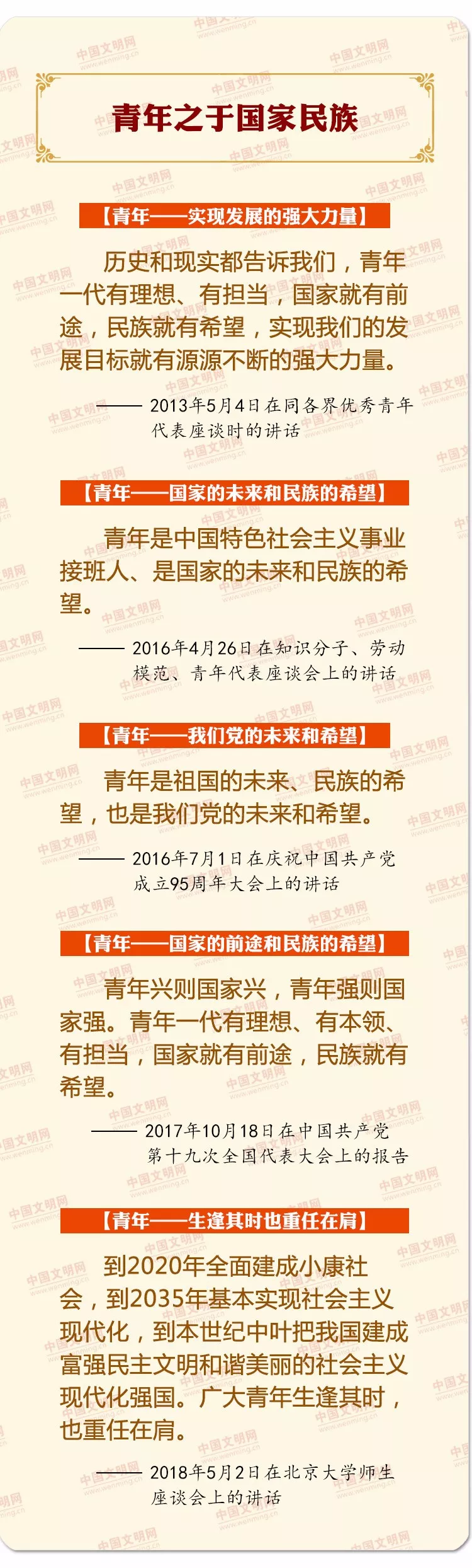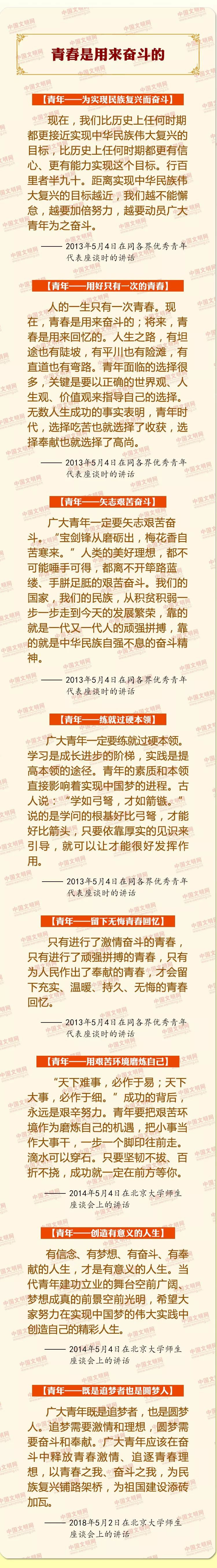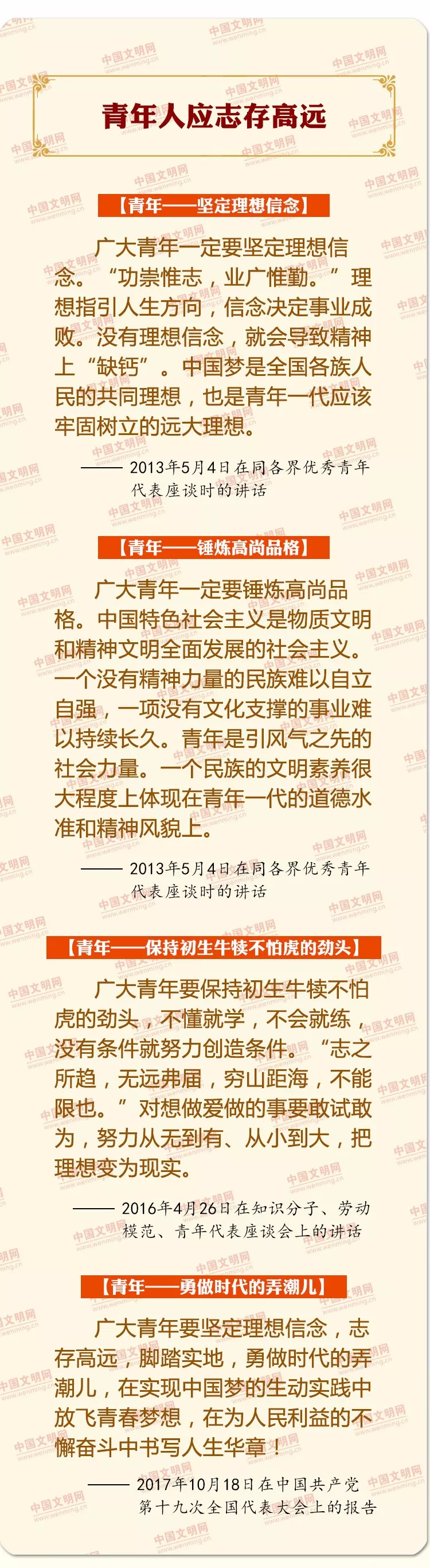 编者按:中国梦是历史的、现实的,也是未来的。中华民族伟大复兴的中国梦终将在一代代青年的接力奋斗中变为现实。习近平总书记曾在多个重要场合对青年有过殷切寄语、谆谆教诲。在五四青年节来临之际,我们精选摘编部分重要论述,与广大网友一起学习、共同进步。