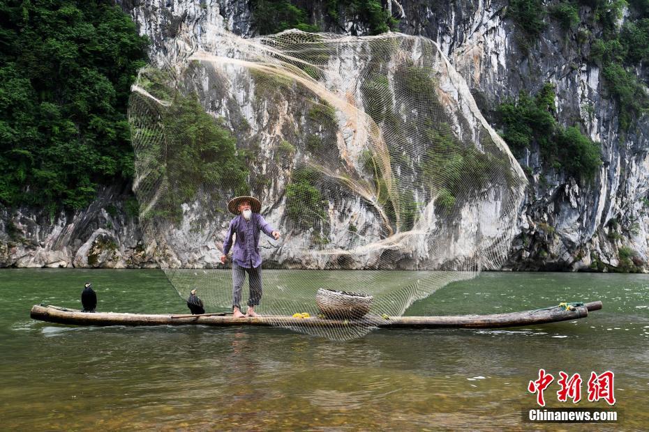 79岁的黄月创正在表演漓江传统渔事。中新社记者 俞靖 摄