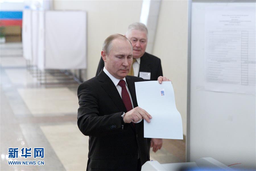 资料图:3月18日,俄罗斯现任总统普京(前)在莫斯科的一处投票站投票。新华社记者 白雪骐 摄