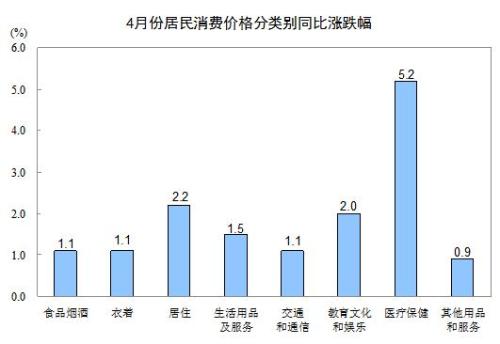 其他七大类价格同比均上涨。其中,医疗保健、居住、教育文化和娱乐价格分别上涨5.2%、2.2%和2.0%,生活用品及服务、衣着价格分别上涨1.5%和1.1%,交通和通信、其他用品和服务价格分别上涨1.1%和0.9%。