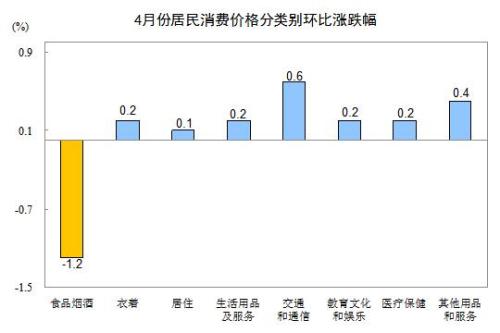 4月份,全国居民消费价格环比下降0.2%。其中,城市下降0.2%,农村下降0.3%;食品价格下降1.9%,非食品价格上涨0.2%;消费品价格下降0.5%,服务价格上涨0.3%。