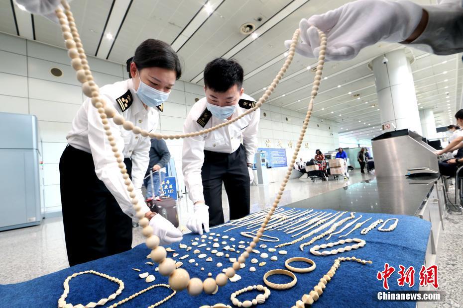 4月11日,广州海关通报,1-3月,该关在空港旅检渠道共查获象牙走私案件62宗,涉及象牙及制品24.16千克,同比分别增长1.38倍、2倍。图为近日海关关员清点查获的走私象牙制品。中新社记者 池兆恩 摄