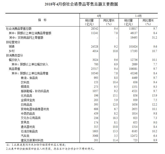 据国家统计局网站消息,2018年4月份,社会消费品零售总额28542亿元,同比名义增长9.4%(扣除价格因素实际增长7.9%,以下除特殊说明外均为名义增长)。其中,限额以上单位消费品零售额11241亿元,增长7.8%。