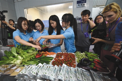 昨日,志愿者将实验舱内的植物带出舱外展示。