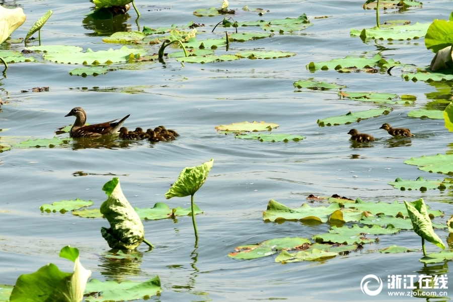 5月15日,西湖断桥荷塘出现了今年第4窝小鸳鸯,此次共10只。与西湖第1窝时的独苗相比,此窝可算是一个大家庭, 这让鸳鸯妈妈忙不过来了。(浙江在线拍友 里尔 摄)