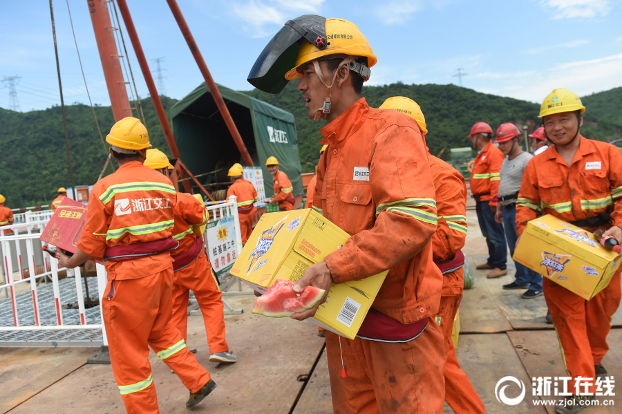 5月16日,杭州持续高温,最高气温达37.5℃。在G25长深高速德清至富阳段扩容工地,工人正在抓紧建设跨富春江大桥。承建施工项目的浙江交工宏途交通建设有限公司,为一线建设者送来了清凉用品和防暑药品,慰问高温下作业的施工人员。(浙江在线记者 吴元峰 摄)