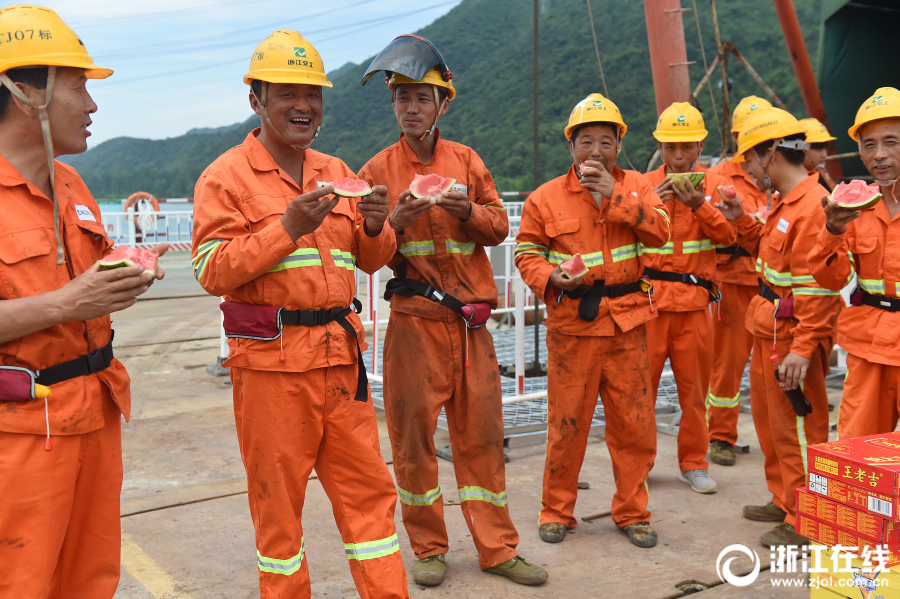 5月16日,杭州持续高温,最高气温达37.5℃。在G25长深高速德清至富阳段扩容工地,工人正在抓紧建设跨富春江大桥。承建施工项目的浙江交工宏途交通建设有限公司,为一线建设者送来了清凉用品和防暑药品,慰问高温下作业的施工人员。(浙江在线记者 吴元峰 摄)