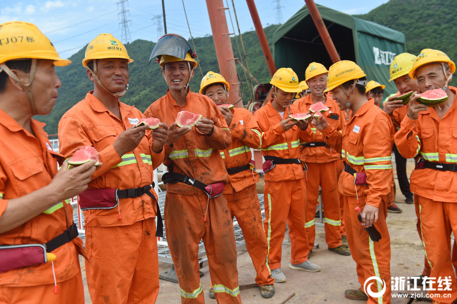 5月16日,杭州持续高温,最高气温达37.5℃。在G25长深高速德清至富阳段扩容工地,工人正在抓紧建设跨富春江大桥。承建施工项目的浙江交工宏途交通建设有限公司,为一线建设者送来了清凉用品和防暑药品,慰问高温下作业的施工人员。(浙江在线记者 吴元峰 摄)