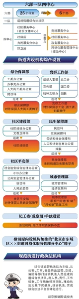 街道“大部制”改革怎么改?东城区委常委、组织部长王清旺介绍,原来一个街道有25个科室,力量比较分散,这次调整后,“六部一队四中心”,整合力量,使工作力量聚焦到公共服务、公共管理和公共安全上来。