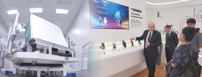 图左为维信诺(固安)第六代全柔AMOLED生产线智能车间,图右为维信诺总裁张德强博士(左一)介绍柔性屏产品终端应用。资料图片 制图:张丹峰