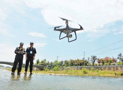 5月17日,浙江省杭州市临安区天目山镇,河道管护队员在操作无人机巡河。胡剑欢摄(人民视觉)