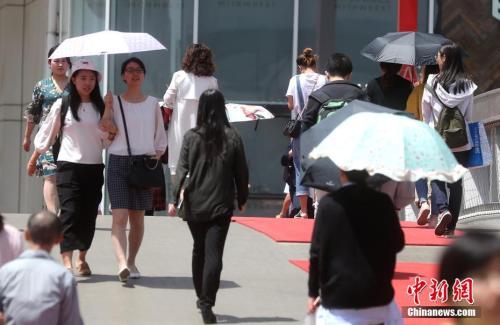 5月23日,北京西单街头,出行的民众撑伞防晒。 中新社记者 张宇 摄
