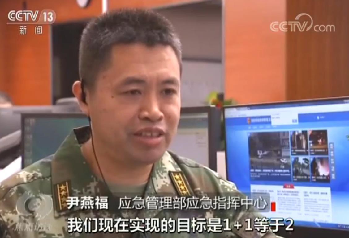 应急管理部应急指挥中心尹燕福表示:“短短一个月的时间,我们现在实现的目标是1+1等于2,已经形成了一个合力,形成了一个拳头,形成了一个整体。下一步会有这样一个大的系统,我们正在规划,正在组织研究论证国家的应急管理信息网络体系,最后整个信息的融合,会形成一种物理性到化学性的反应,就是1+1大于2的目标。”
