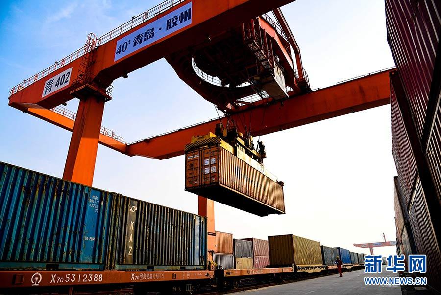 在青岛胶州湾国际物流园,龙门塔吊在往中亚班列上装载货物(2018年5月7日摄)。该班列将通过阿拉山口至哈萨克斯坦的阿拉木图。新华社记者 郭绪雷 摄