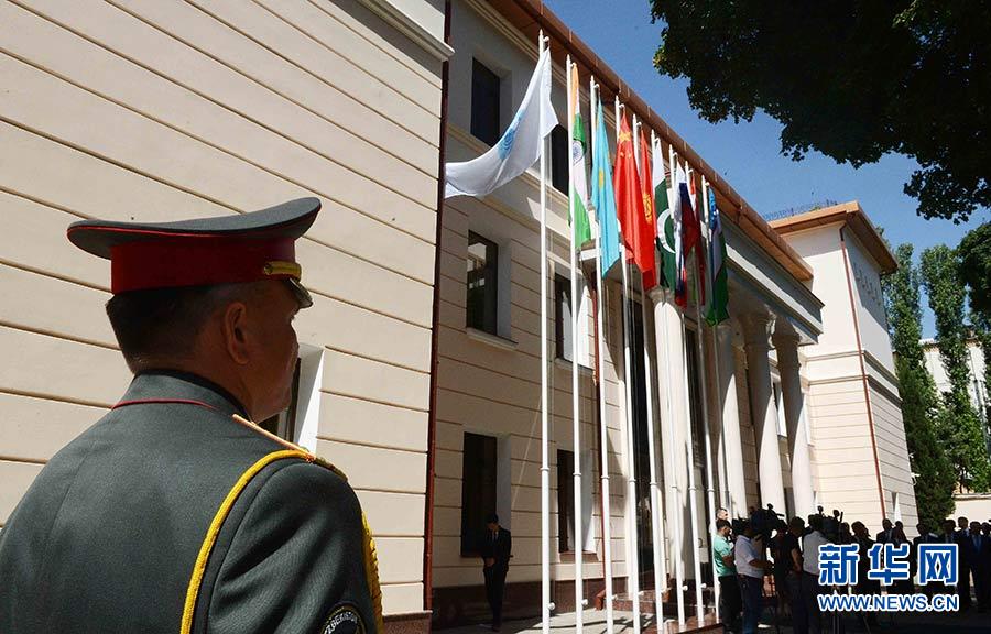 2017年6月15日,上合组织新成员印度、巴基斯坦两国国旗,首次在设在北京的上合组织秘书处迎风飘扬。