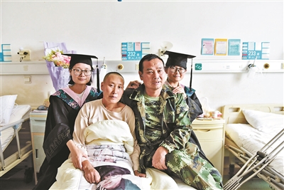 由于母亲周玉梅需要在病床上休息,经过医生同意后,李梦楠花20元为母亲租了轮椅,在医院的楼道和病房里与同学们一起拍了合影。照片里,周玉梅戴上了女儿的学士帽,微笑着面对镜头。