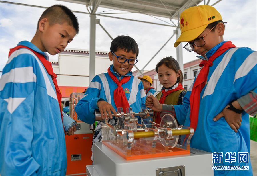 几名学生在拉萨市流动科技馆巡展活动现场体验科学小实验(5月24日摄)。 新华社记者 刘东君 摄