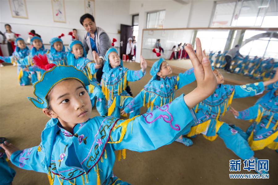 江苏省南通市海安县西场小学学生在练习京剧(5月26日摄)。新华社发(徐劲柏 摄)