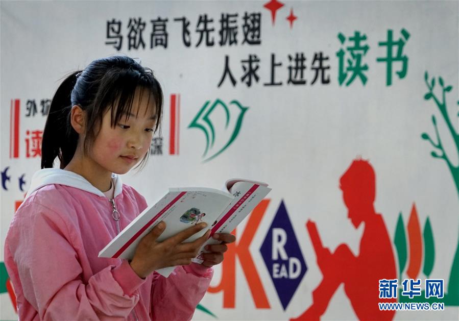 河南焦作市博爱县寨豁乡小学学生郭艳冰在校内阅读从“焦作市图书馆馆外流通点”借阅的书籍(4月18日摄)。新华社记者 李安 摄