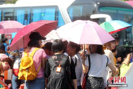5月31日,北京遭遇高温天气。北京西站广场候车民众撑伞防晒。 中新社记者 张宇 摄