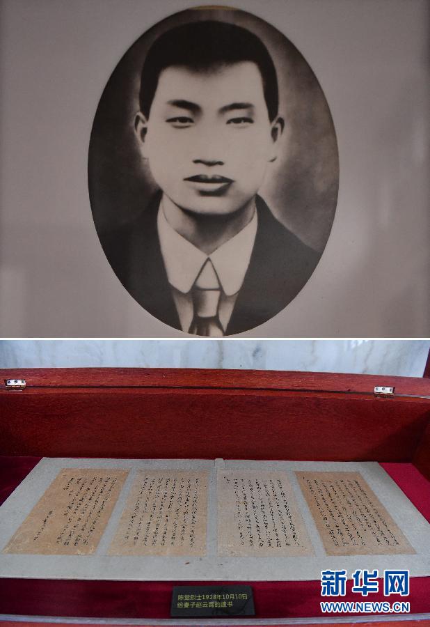 拼版照片:上图为陈觉像;下图为湖南省长沙市烈士公园展出的陈觉烈士写给妻子赵云霄的遗书(5月7日摄)。新华社发