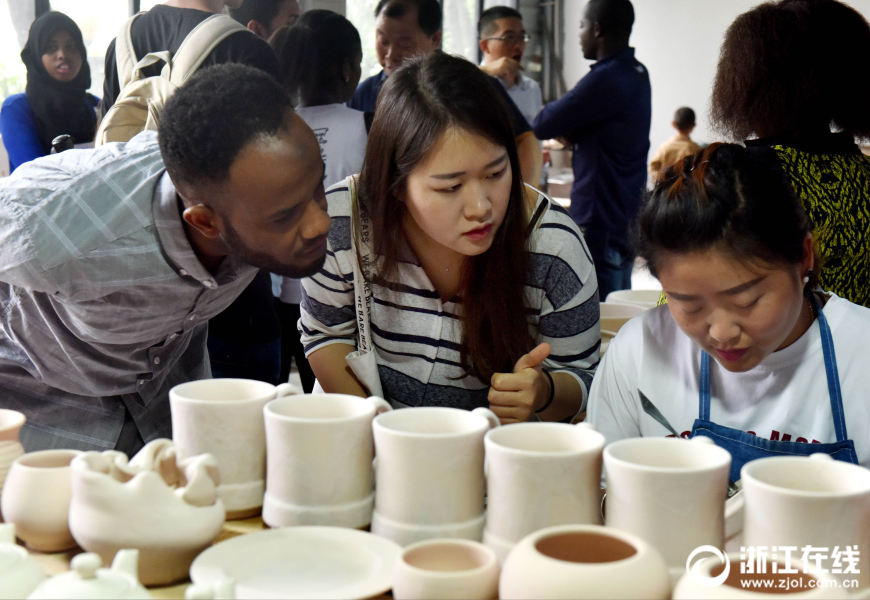 2018年6月3日,来自30多个国家的70多名留学生,在武义汉坊婺窑认真学习修坯、上釉等环节。