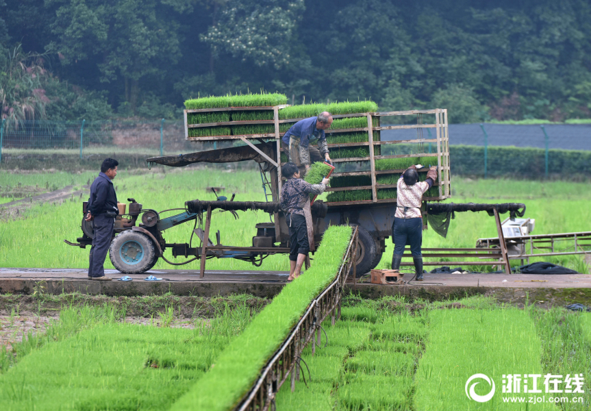 武义县一育秧工厂员工忙着为订单农户起运单季稻秧苗。