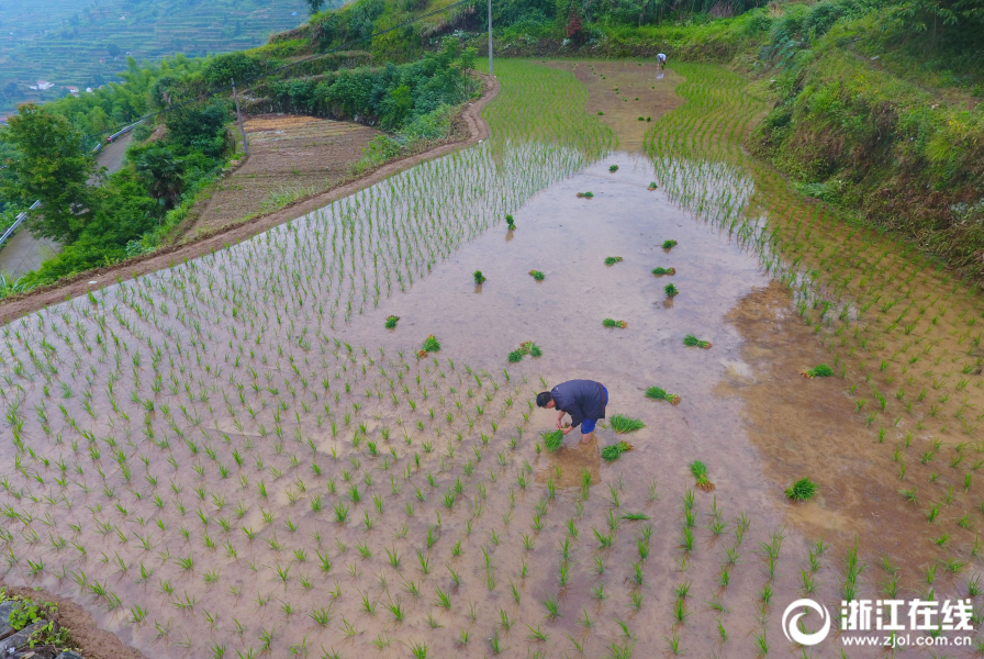武义县新宅镇大莱村一农户在梯田上手工插种单季稻。
