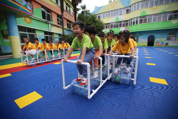6月4日,湖北省襄阳市实验幼儿园的孩子们用由饮用水桶制作的团队小车进行比赛。实验幼儿园教师和家长们将包装箱、轮胎、易拉罐等废旧材料再利用,制作成玩教具、装饰品、花盆等,培养孩子们勤俭节约、低碳环保的意识。