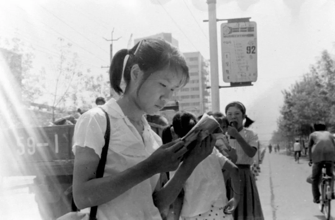 ▲1982年,一名天津考生在等汽车的时候抽空读书。(新华社发)